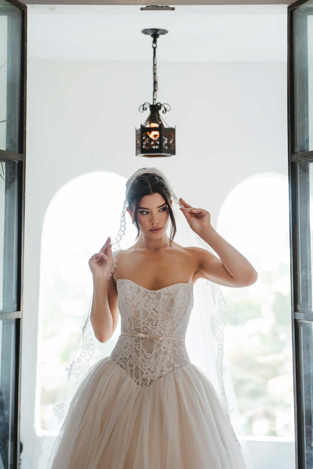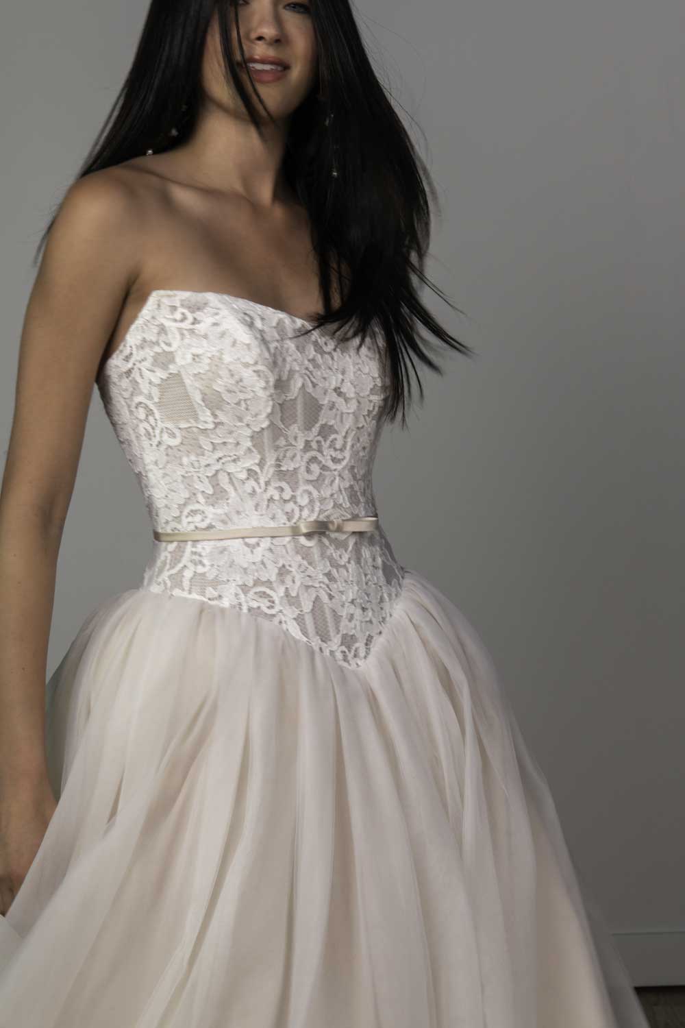 Ivory Lace and Tulle over Biscotti Gown with Biscotti Satin Belt